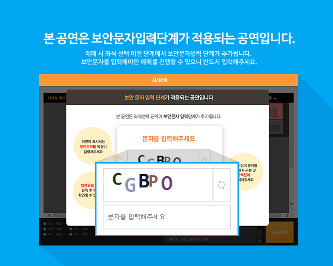 ※ 좌석은 예매하신 순서대로 기획사에서 배정이 되며 좌석번호는 공연당일 티켓수령 후 확인하실 수 있습니다.
